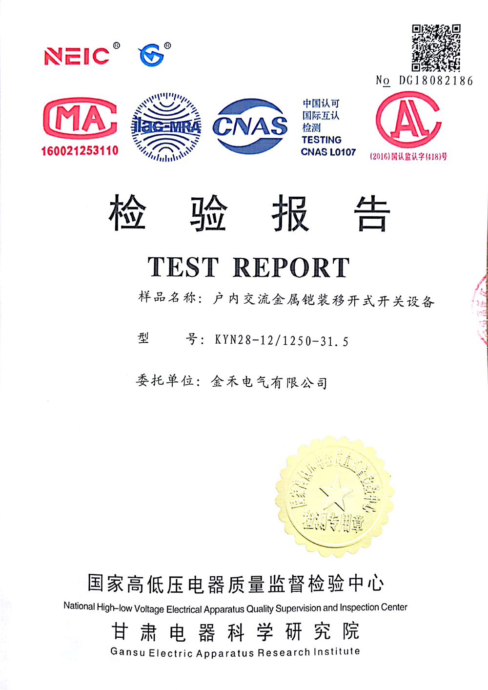 KYN28-12/1250-31.5户内交流金属铠装移开式开关设备 检验报告