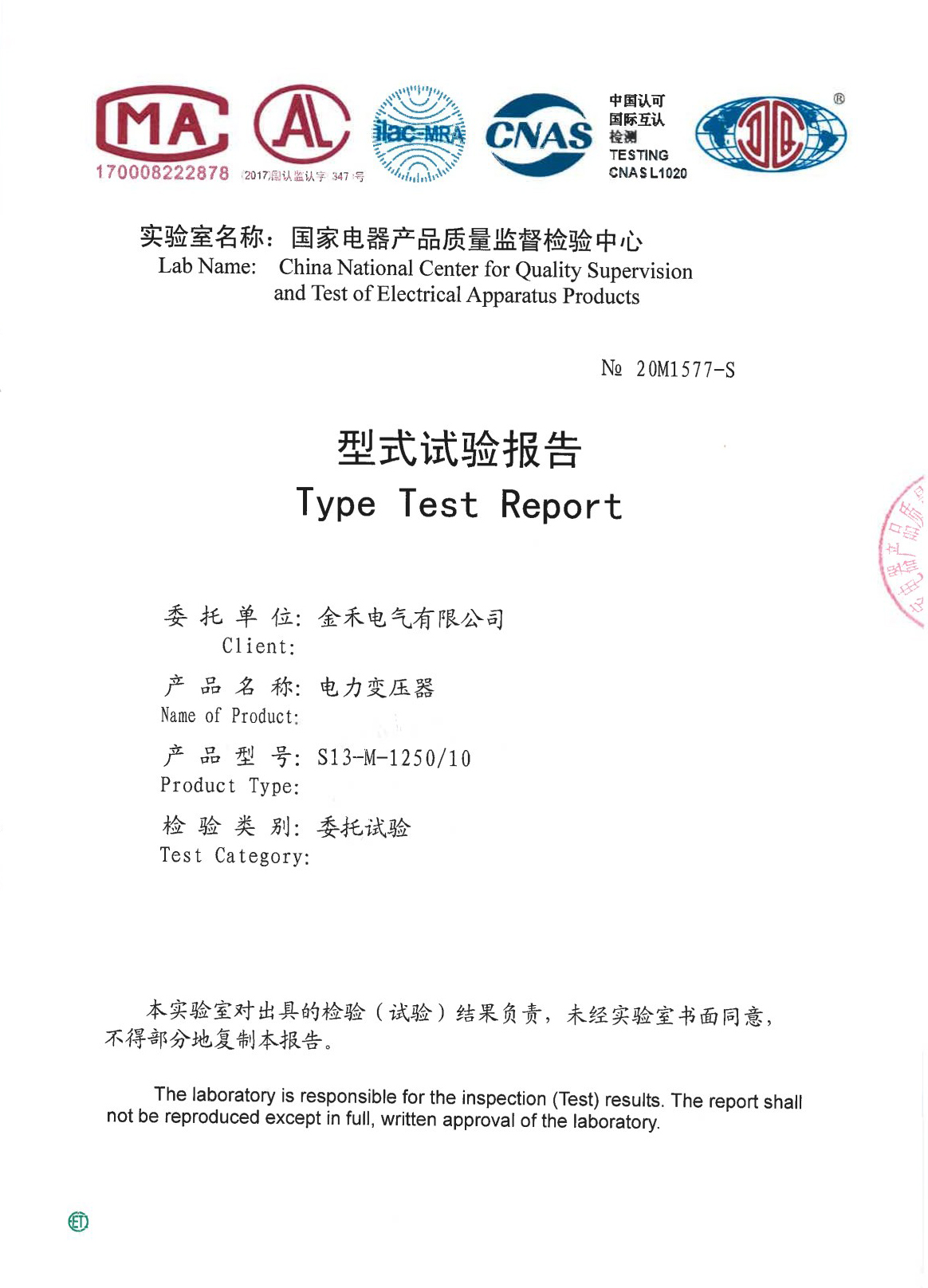 S13-M-1250/10电力变压器 型式试验报告