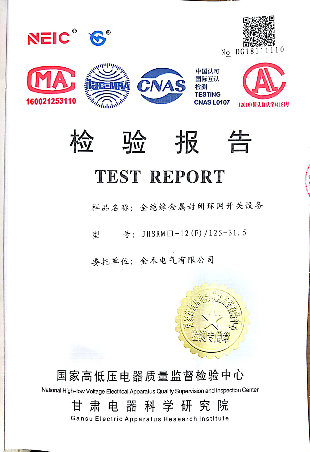 JHSRM口-12(F)/125-31.5全绝缘金属封闭环网开关设备 检验报告