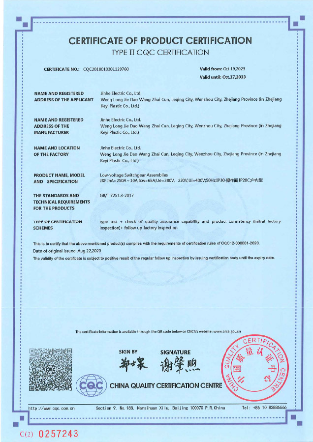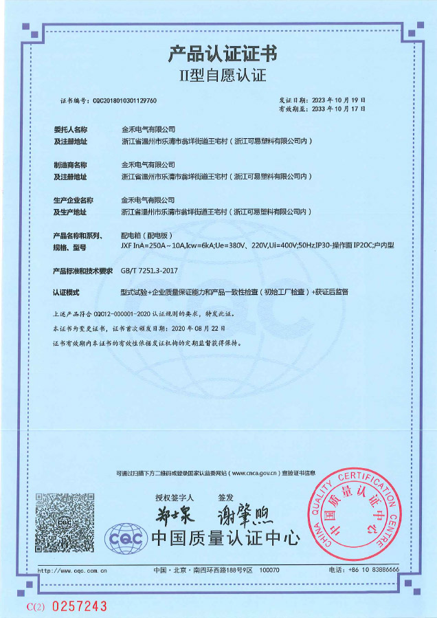 JXF配电箱 产品认证证书